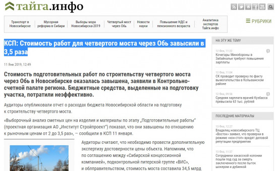 ТАЙГА.ИНФО: "КСП: Стоимость работ для четвертого моста через Обь завысили в 3,5 раза".